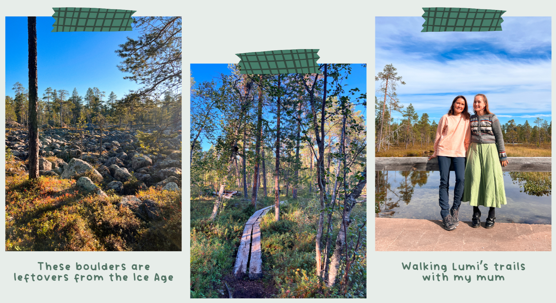To understand the setting, I needed to see it – so after Ranua, we travelled further north, way past the Arctic Circle. Visit Inari kindly hosted me in their incredible Aurora Cabins. Although the northern lights didn’t appear on this trip, I got to walk the same trails Lumi, Oskár, and Wolf take to the National Park. I saw what the trails are like (lots of roots and rocks!) and what trees grow in the area. I even got to visit a holy seida site!